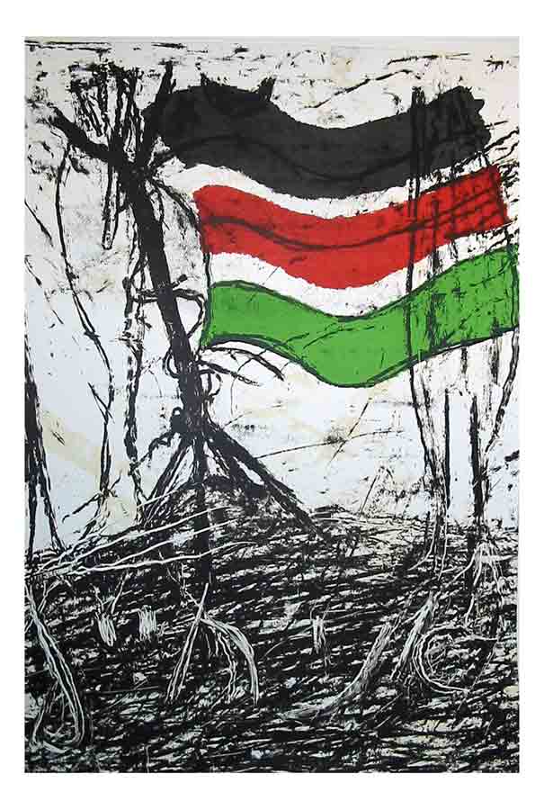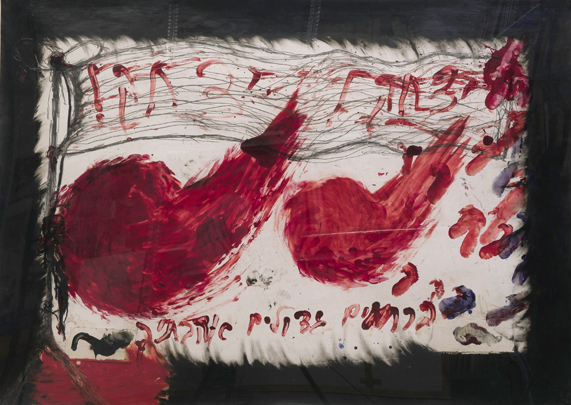 Muchos de sus cuadros están cargados de símbolos históricos, sagrados, y pasajes en hebreo. La obra es a veces conceptual, a veces figurativa, a veces colorida y sensual, quizás por el rojo. Pero a veces es también gris. Y oscura. Bajo todas sus apariencias, estamos ante una obra crítica. A sus 78 años, Gershuni hace parte de una generación que creció a la sombra del holocausto. Yo diría que su obra es una sofisticada protesta política contra toda forma de maltrato, toda forma de abuso, como la que ejerce ahora su propio país contra el pueblo palestino (la imagen de la derecha). En su trabajo está presente la guerra como un malestar constante.