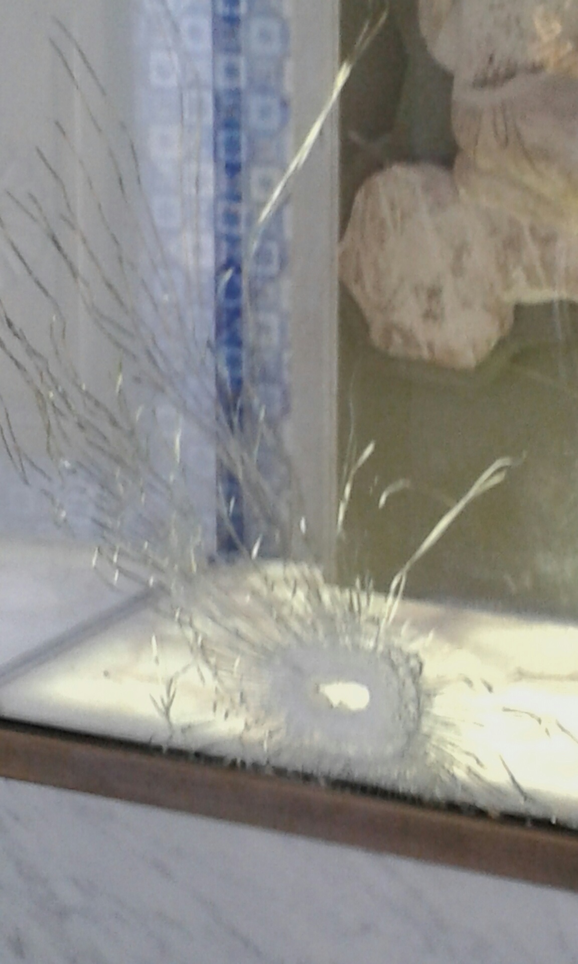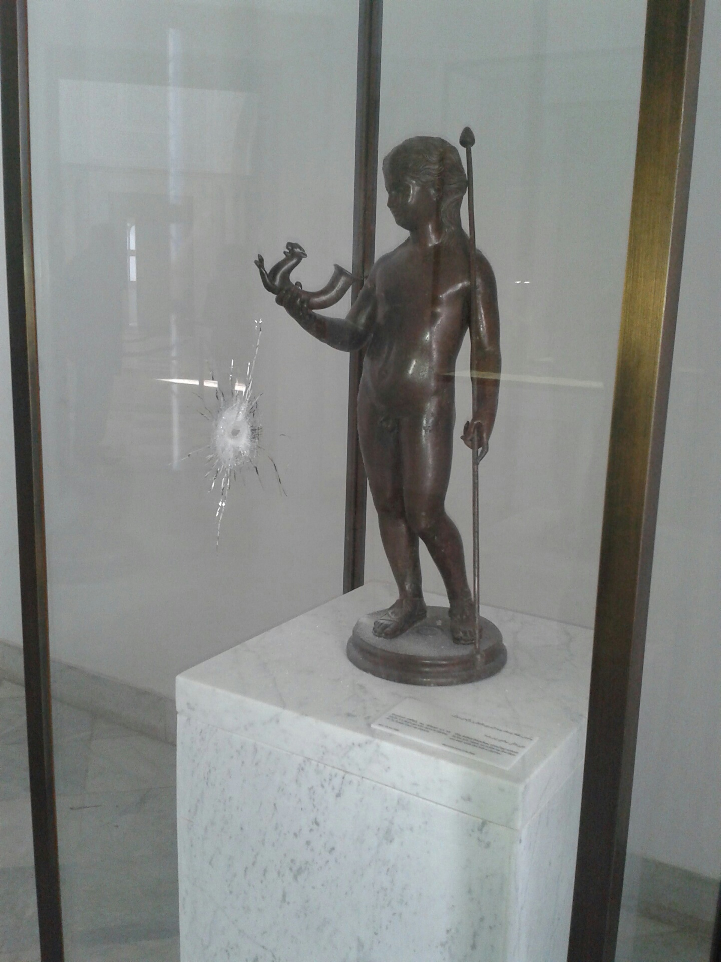 Era el primer día que abrían el museo después del ataque en el que murieron numerosas personas. Casi no había nadie. Los pocos que nos aventuramos esa mañanaa entramos con un poco de aprensión, como dudando de que fuera cierto que las puertas estaban abiertas al público. Pero lo estaban y pudimos recorrer los pasillos y salas a nuestras anchas. En varias de esas salas se veían todavía las señas contundentes de la tragedia. La sala de Hércules y Dionisios fue de las mas afectadas. Estas dos imágenes corresponden a vitrinas de esas salas: