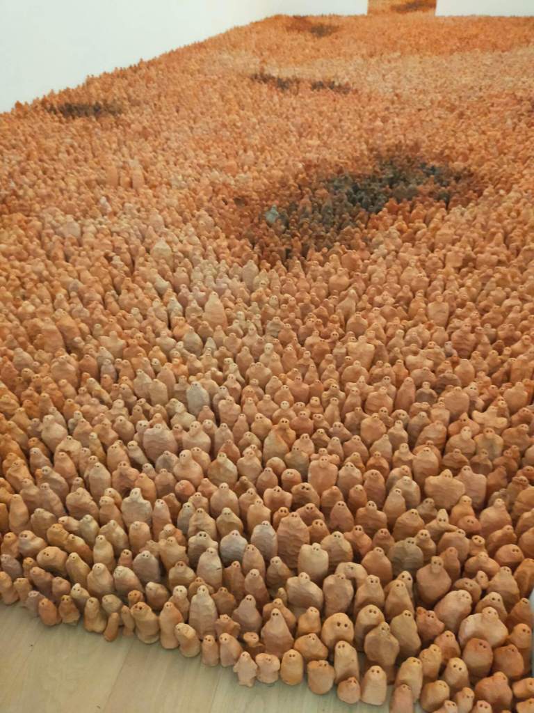 Pararse delante de la puerta grande de la sala en la que está la obra en el Voorlinde produce un efecto extraño. Las figuras son pequeñas, apenas se levantan unos centímetros del suelo, pero al estar frente a ellas sientes que la mirada de esos miles de ojos te atraviesa. Y a pesar de que los ojos son huecos, tienen una mirada que parece interrogarte, ¿qué es lo que quieren? Por eso digo que el efecto es extraño, uno no sabe qué pensar en primera instancia frente a esas miles de figuras hacinadas en un espacio enorme y neutral, que amenazan avanzar hacia la salida mientras sus ojos profundos cuestionan insistentemente al espectador.