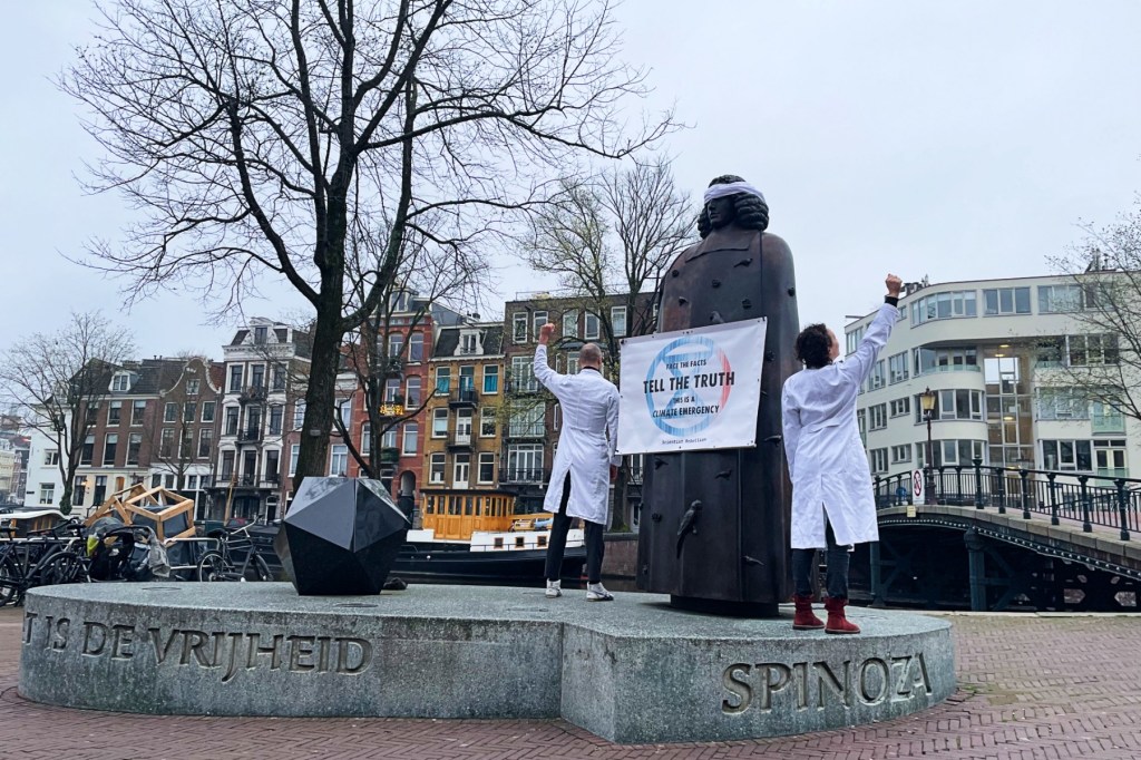 He aquí una foto de activistas de Scientist Rebellion protestando junto a la estatua de Spinoza en Ámsterdam: